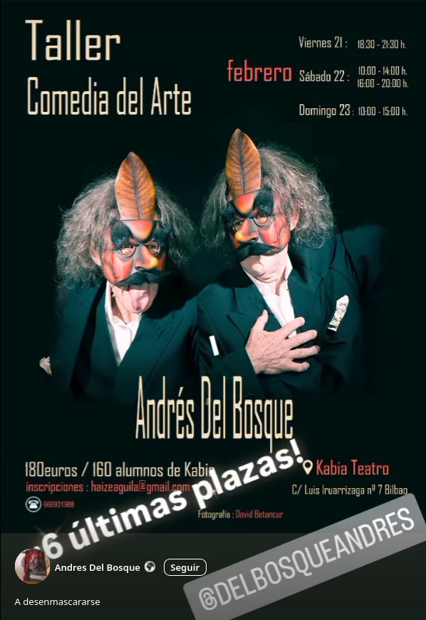 Taller: Comedia del arte, Bilbao21 febrero 2025El fin de semana 21, 22 y 23 de febrero de 2025 daré un taller de Comedia del Arte en Kabia Teatro, en Bilbao (España).Más detalles e inscripciones: xxx EN gmail.com o al telefono 666xxxxxx