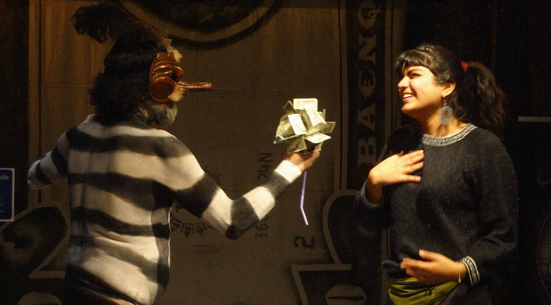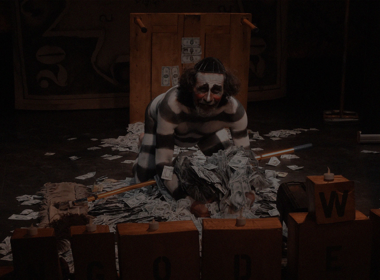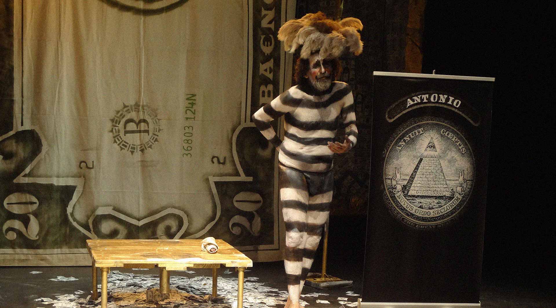 Este saltimbanqui se nos presenta como un banquero anarquista que denuncia el fanatismo con que muchas economías, a través de la carga de la deuda, han sido aniquiladas y que señala la acumulación de riqueza financiera, cada vez en menos manos, como un teatro cínico que ha alcanzado obscenas proporciones.